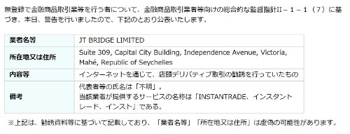 JT BRIDGE LIMITEDは関東財務局より警告を受けています。