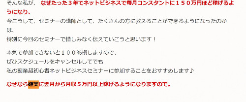清水淳の確実収入アップセミナーは怪しいです。こういったセミナーで本当に稼げるようになったという話を聞いたこと無いですし、『セミナーで知り合った人にセミナー後の懇親会で出資を持ち掛けられた。支払った後に音信不通になってしまった。』ようなトラブルが大量発生しているのが、ネットビジネス系のセミナーの実態なんです。悪いこと言わないから参加しないほうが良い。