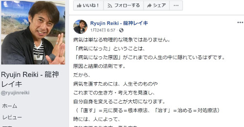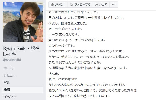 ヒーラーの龍神レイキ(本名:川島伸介)は怪しいので気をつけてください。龍神レイキだけでなく、レイキ関係は全て詐欺だとみなしましょう。最近の例で言うと、水谷千加がそうでしたよね。48万6千円というバカ高い受講料を請求し、お金が無いから無理と言うとクレカまで作らせた、あのインチキレイキの 水谷千加。消費者センターが連絡しても取り合わなかった強欲業者でした。