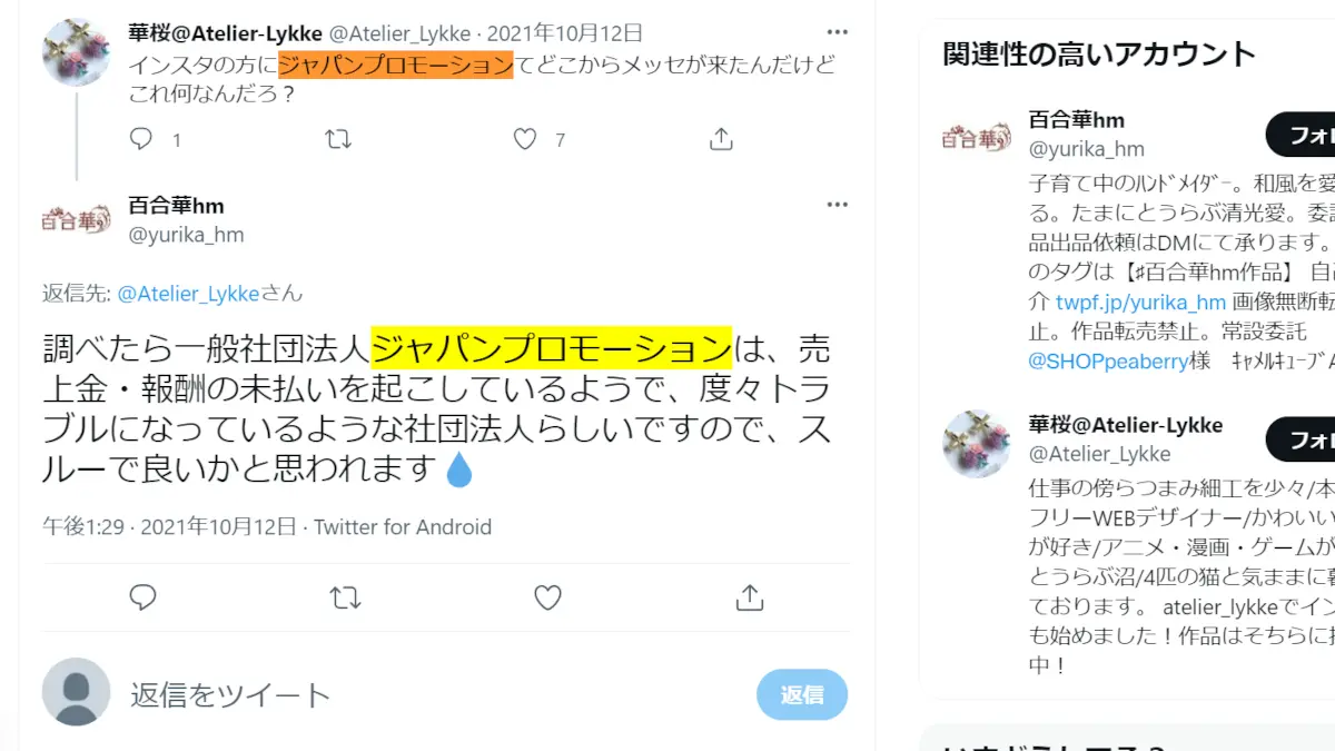 ハンドメイド作家をしている友人が一般社団法人ジャパンプロモーションという海外イベントあっせん業者に勧誘され、料金を失ったみたいなのです。法外に高い出品料を取られた上にサポートを全くしてくれない、返事が全然こないなど。でも支払いの請求だけはしつこく何度もくる。この請求の内訳もおかしく、最初に聞いていた値段からどんどん釣り上がっていくのだそうです。いざイベントへ行ってみると事前に聞いていたものと全然違う環境でした。VIPブースだと言われたのに入口から一番遠い場所だったようです。契約違反があったり、委託した作品を返さない、また問い合わせ等にも未対応など聞いているだけでもとても酷かったようです。