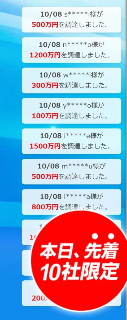 断言しますが、これは嘘の融資実績だと思います。資金調達プロは、融資実績があるように見せかけ、獲物が罠に引っかかるのを待っているのでしょう。仮にも東証上場企業がこのようなサクラ商法に手を染めているとすれば由々しき問題です。資金調達プロの被害にあわれた方は各種機関に相談するようにしましょう。