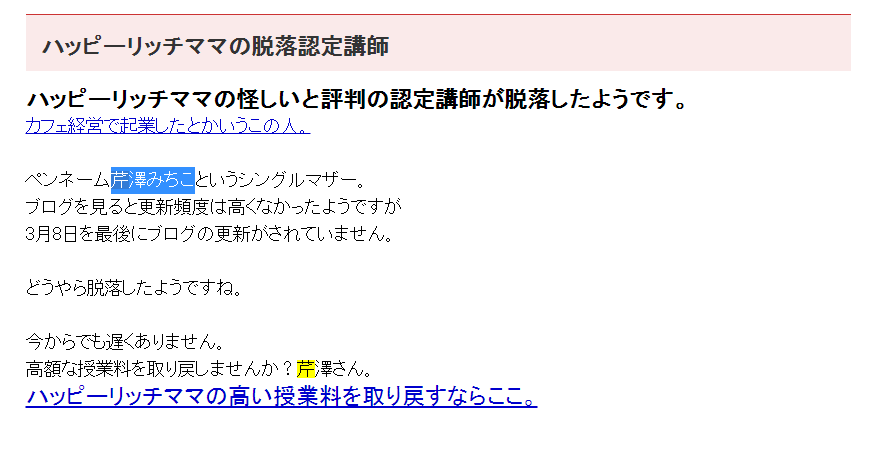 ※当サイトは、芹澤みちこが詐欺をしている、マルチ商法をしている、逮捕される等とは主張していません。