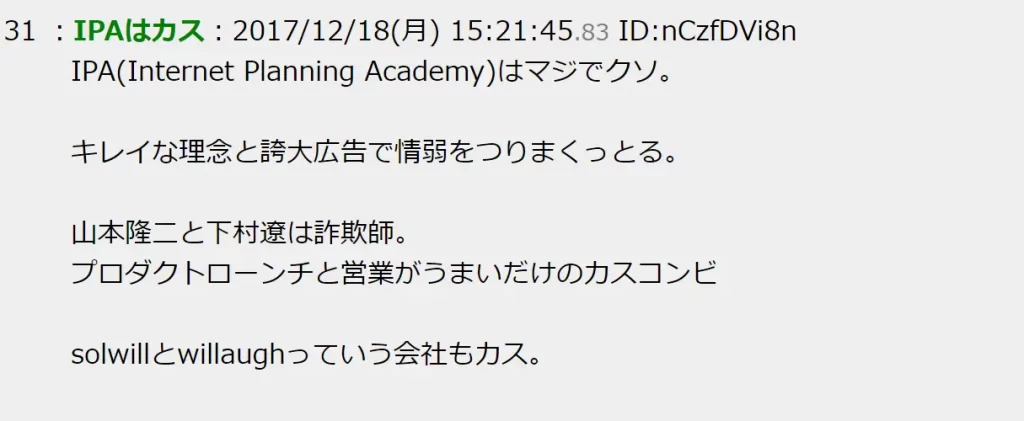 IPA(Internet Planning Academy)はマジでクソ。キレイな理念と誇大広告で情弱をつりまくっとる。山本隆二と下村遼は詐欺師。プロダクトローンチと営業がうまいだけのカスコンビsolwillとwillaughっていう会社もカス。