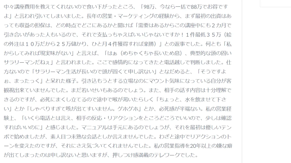 ・契約を渋っていると他のセミナー参加者(おそらくサクラ)から罵声を浴びせられた。