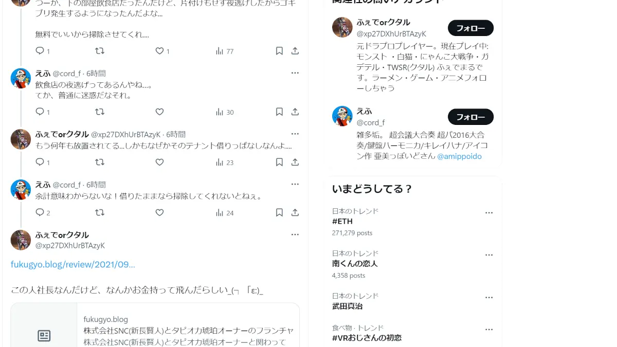 「お金を持って飛んだらしい」との告発がツイッター上で投稿されています。