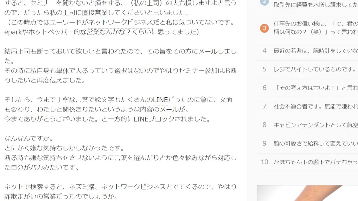 そして、ユーワードはネットワークビジネスですから、仲間づくりの過程でトラブルが起きやすい。ネットワークビジネスというのは、人脈を利用して勧誘していきます。まずは話を聞いてもらわないといけないわけで、最初から儲かるお仕事の勧誘ですなんて伝えたら断られるの必至だから、ただの食事で誘っておいて、おもむろにユーワードの説明を始めるわけですね。