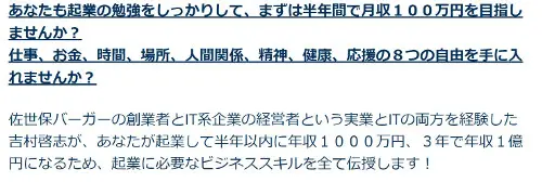 吉村啓志は藤沢涼(麻生孝浩)や小西玲太朗と並んで、与沢翼の会社で副社長をやっていた怪しい経歴の持ち主。『起業して半年以内に年収1000万円、3年で年収1億円になるため、起業に必要なビジネススキルを全て伝授します!』みたいな怪しい情報商材を販売していたのが吉村啓志という男。