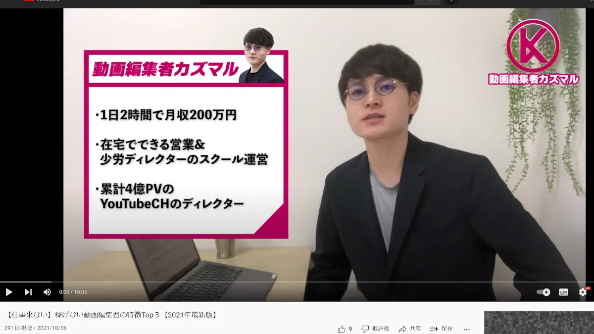 また、カズマルの経歴には「累計4億PVのYouTubeCHのディレクター」と記載があることがわかります。しかしそのわりにはカズマル本体のユーチューブ視聴回数が少なすぎるのです。半年経っても再生回数が291回しかない動画もありました(本記事冒頭画像を参照)。