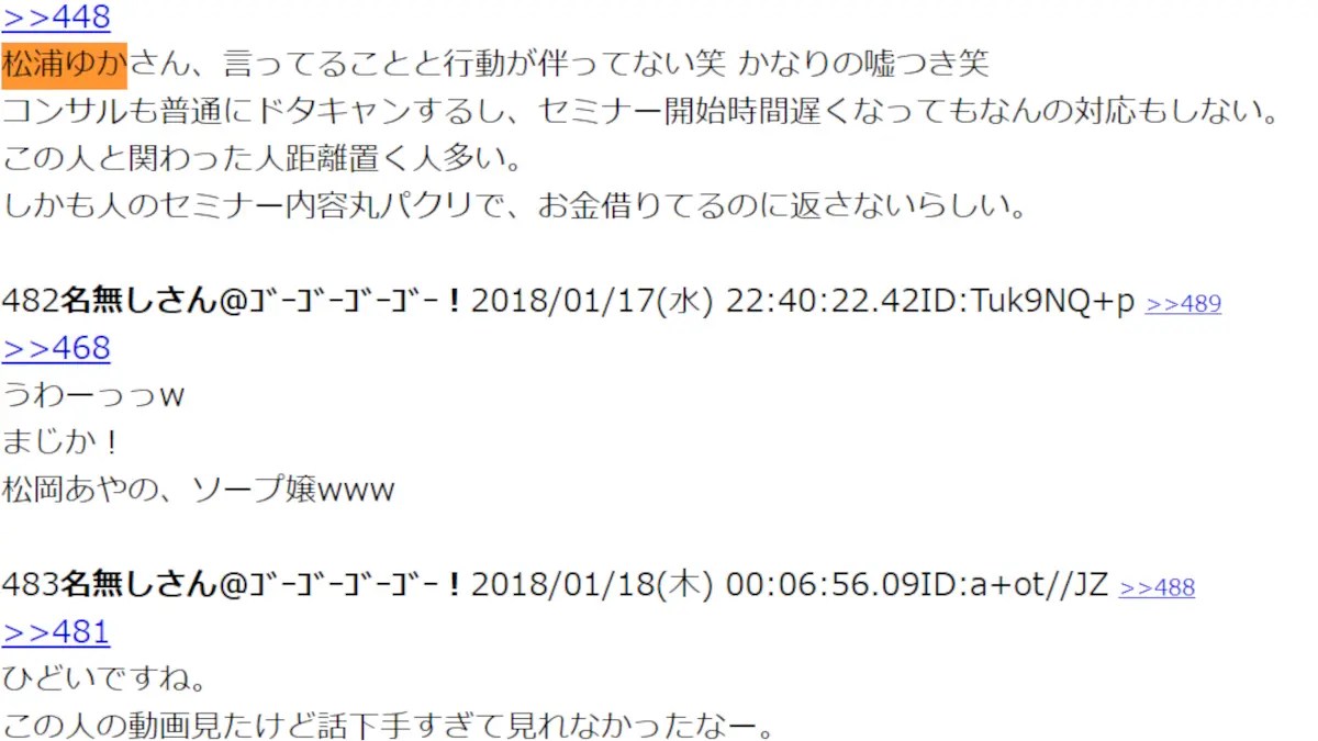 松浦ゆかさんのとある講座受けたんですが対応とか含めてちょっとあ然としました…嘘つきとまではいかないですが言ってることがあとから違ってたりするのでついていけないって思いました