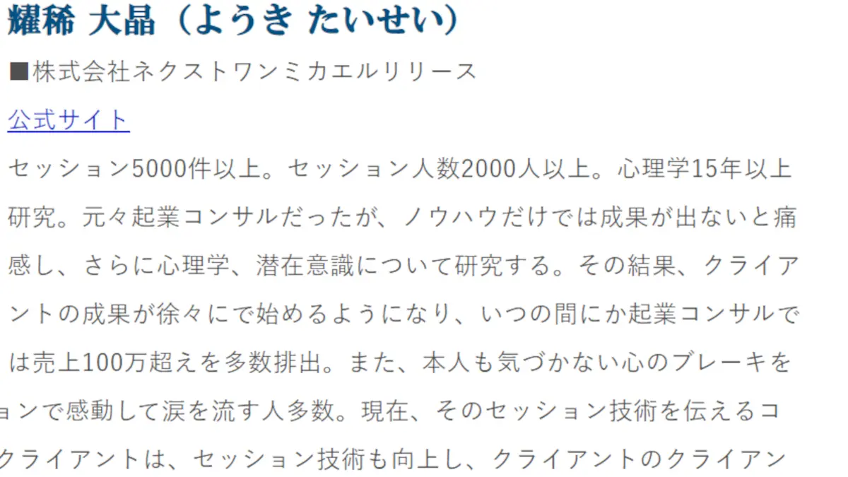 耀稀大晶(ようきたいせい)という方はご存じでしょうか?株式会社ネクストワンミカエルリリース(薄木洋祐)において心理学のセッションを開催している方なのですが、この耀稀大晶が怪しいということで炎上しているので注意喚起させていただきます。心理学を15年以上研究し、起業コンサルで売り上げ100万円以上を輩出させたと豪語する耀稀大晶についてとりあげたいと思います。株式会社ネクストワンミカエルリリースの評判や口コミを探していた方はぜひ参考にしてください。