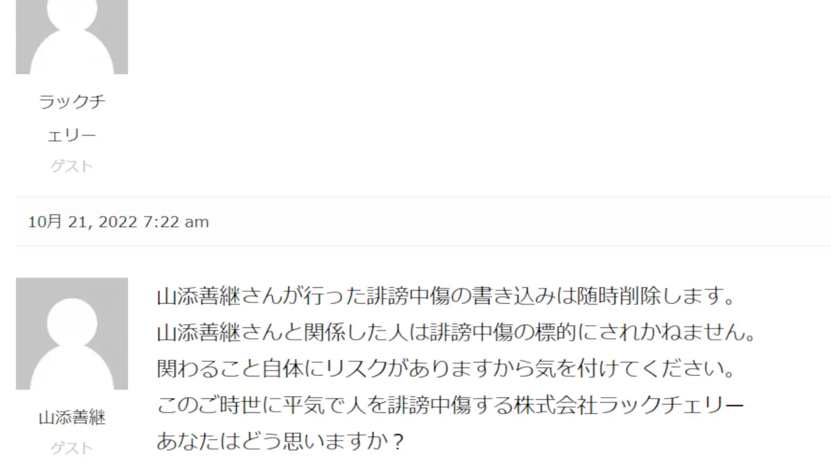 本サイトは、株式会社ラックチェリー,山添善継の評判を募集しています。お気軽にお問い合わせください。