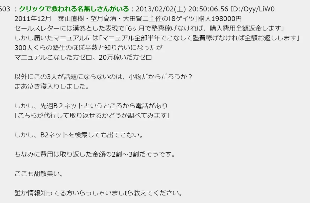 望月こうせいから返金させたいけど泣き寝入りさせられたとする口コミも投稿されているぐらい評判が悪い人間でもあります。