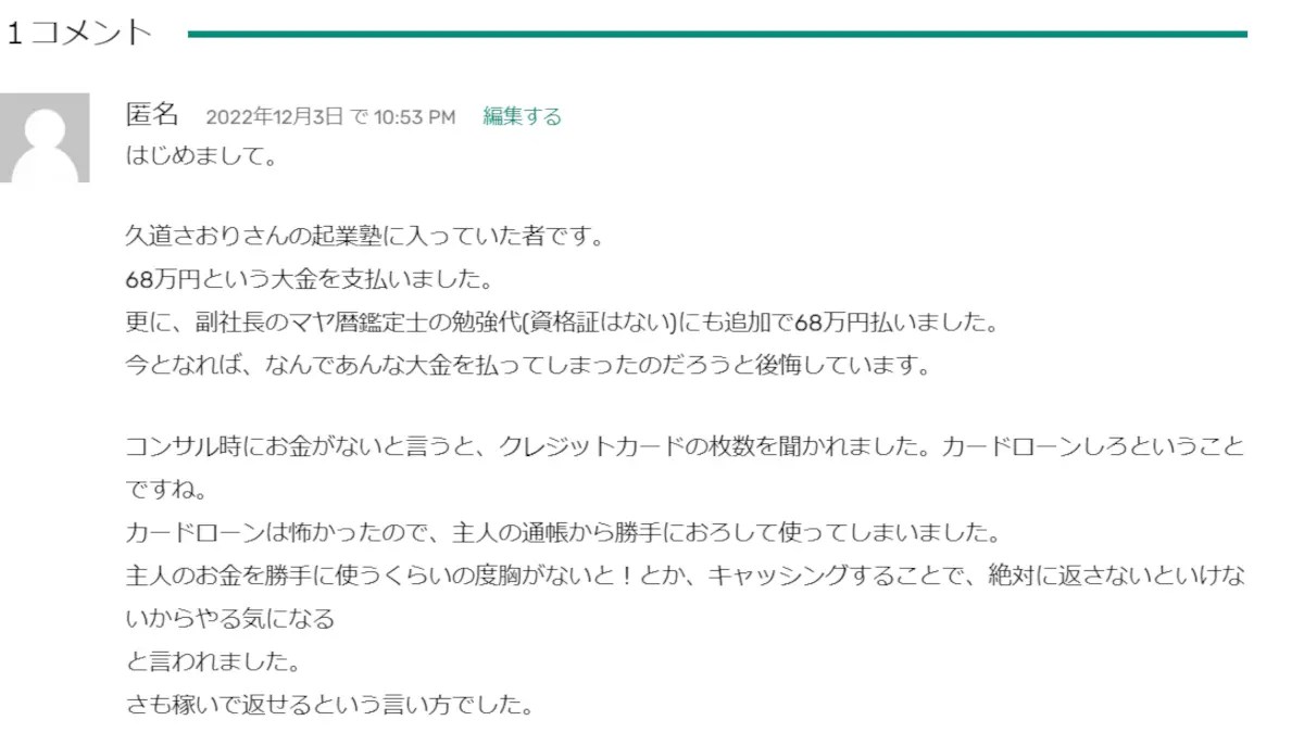 久道さおりさんの講座と東景子さん(副社長)の講座に136万円もの料金を払ってしまいました。主人のお金です。全く稼げなかったので焦っています。