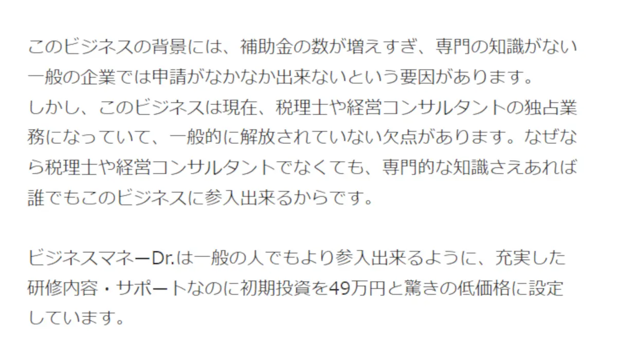 ビジネスマネーDr.(運営:ドクター基地株式会社,中川強)は開業資金49万円で始められる補助金・融資アドバイザー事業のフランチャイズです。コロナショック以降補助金や給付金といった内容が世の中の大きな注目となっています。しかしその一方で不正に給付金を手にする問題もよく報道されており、この点も考えておかなければなりません。pdcaビジネスドクターのフランチャイズに加盟をすると補助金アドバイザーになれるということですが、法的リスクもしっかりと説明を受けておかなければならないでしょう。