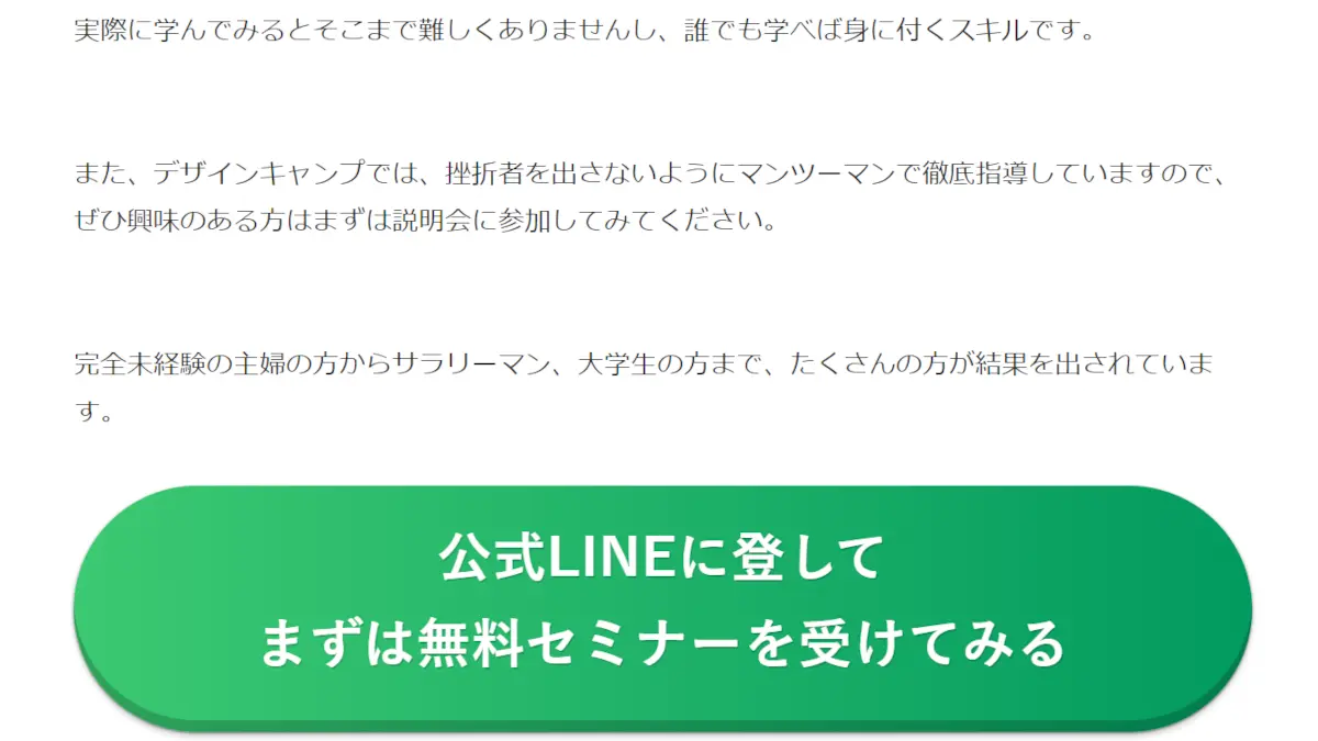 「WEBセミナーに無料で参加できる」と記載がありますが、デザインキャンプ(中村薫)も営利企業で商売としてやっているものですから、無料セミナーでもどこかで料金を払う場面があると思います。費用をかける前に、友人知人をはじめとするセカンドオピニオンに相談して、怪しいと思う部分はしっかり早めに解決しておくことをオススメします。