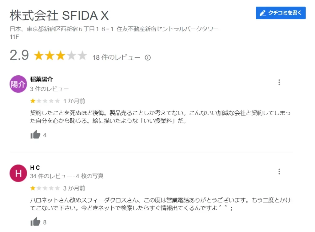 もちろんこの口コミが全てではありませんが一方で、火のない所に煙は立たないという格言もあります。『株式会社sfida x』『住田悦郎』の名前が出てきたら用心するに越したことはないでしょうね。