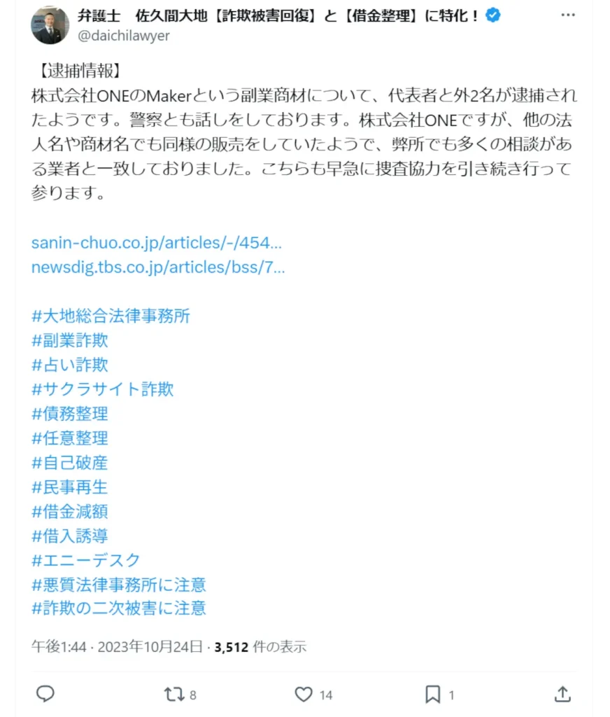 株式会社ONEの情報商材「メーカー」を詐欺だと書き立て「本当に稼げる副業はこちら!」ということで詐欺の副業に誘導しているブロガーがいます。その筆頭格があずま、田中、ガイド山田。詐欺師として、その名前をエクセルなどにメモしておきましょう。(詳しい内容を知りたい方はここをクリックしてください。)