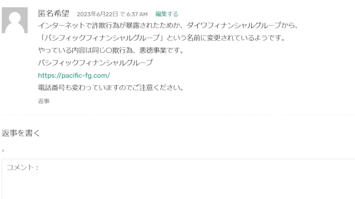 クーリングオフをしようにも出来る期限が過ぎていてクーリングオフ出来ず、パシフィックフィナンシャルグループからはヤクザみたいな社員が自宅まで取り立てに来られました。