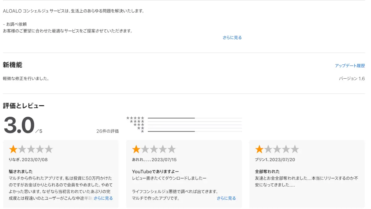 ALOALOはコンシェルジュであると謳っており、例えば旅行はあのアプリ、通販はこのアプリ、交通関連に突いて調べるにはこれ、という細分化されたアプリを一本化し、あなたに必要なサービスを必要なときに手配、或いは届けるなどのサービスを行ってくれるということです。ここまで聞くと、何か高度なAIを搭載したアプリだろうか?と思われるのですが、特にそういうものでもありません。そもそも見た目はシンプルですが、必要な情報まで欠けていると思われるような極めて簡素なものです。あくまでもパッと見ただけでは何をどうできるのかわからないため、必然的にDL数も少ない、そのためレビューも少ないということが起こっています。ただし、そのレビューも現在時点で3件しかなく、マルチ商法で作られたアプリ、さらにはその被害者が金も友達も奪われたという告発じみた内容まで書かれている始末です。(本記事冒頭画像を参照)