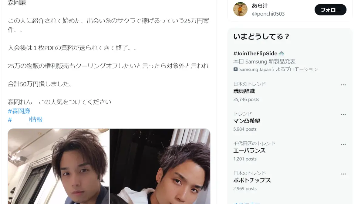 口コミによると、森岡廉は出会い系で稼ぐ方法や物販で稼ぐ方法の情報商材を販売しており、お金がない人には消費者金融で借り入れをさせているようです。まともな事業者とは思えないので、森岡廉には返金を要求したほうが良い印象です。