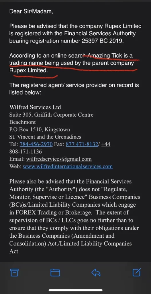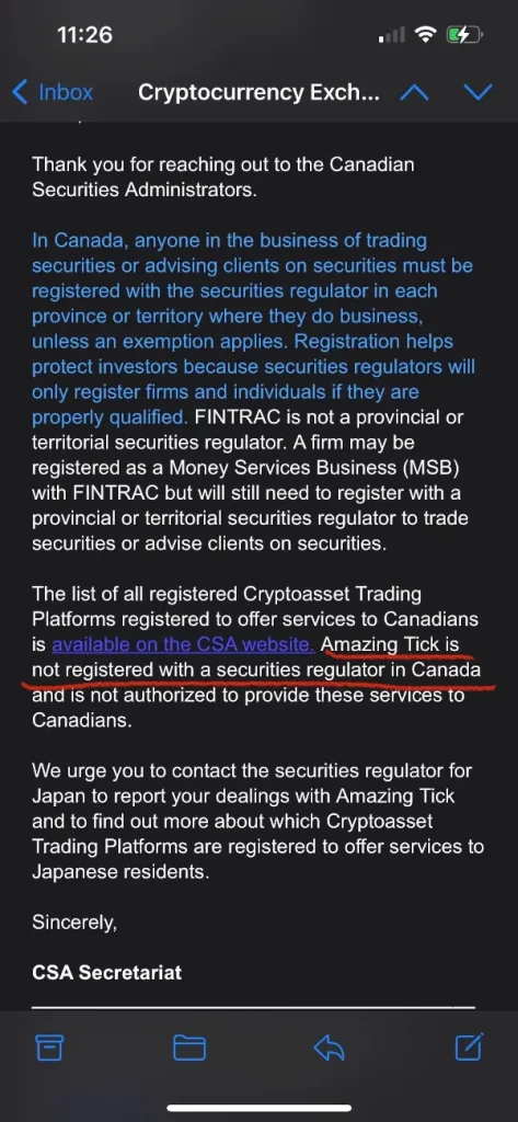 両国ともAmazing Tick(Rupex Limited)で会社としての登録はあるけど、証券会社のライセンスは取得されてないという内容で、例えばカナダ国内でもFINTRCに登録があったとしてもカナダ人にさえにサービスが提供できなく、ビセント島でも仮想通貨に関しての許可は国自体が許可をどの取引所にもしてないという内容です。