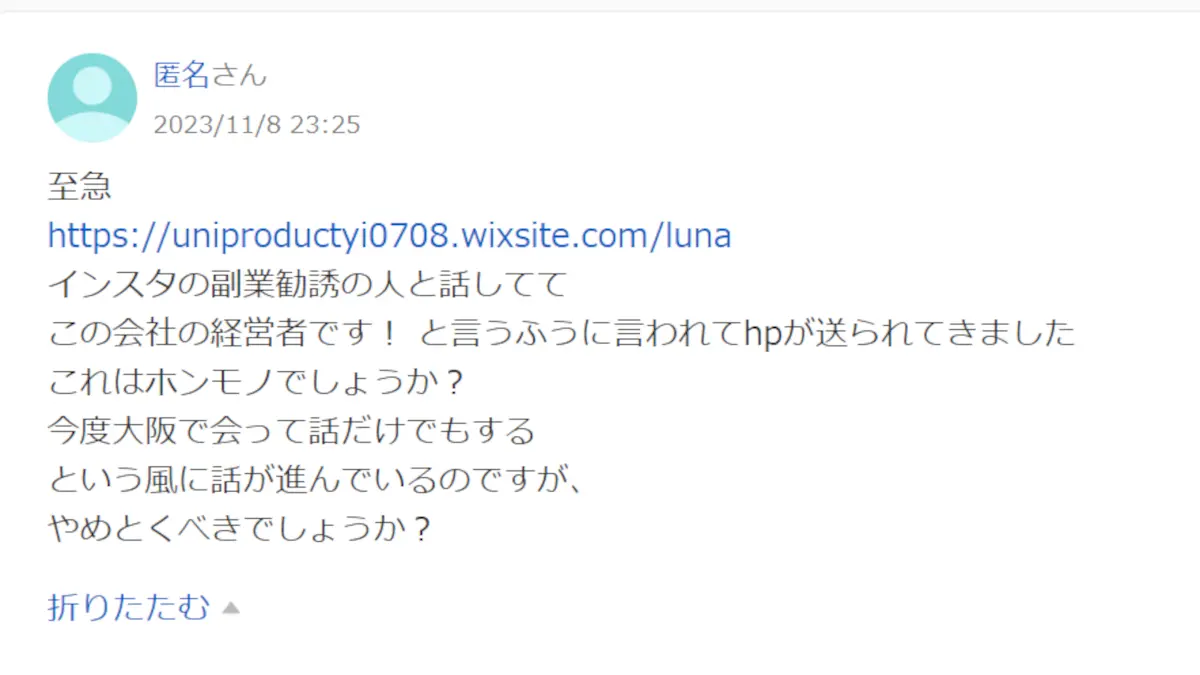 大阪の土山愛斗(株式会社Luna)が勧誘する副業の中身は今のところ不明。読者様の情報提供をお待ちしております。