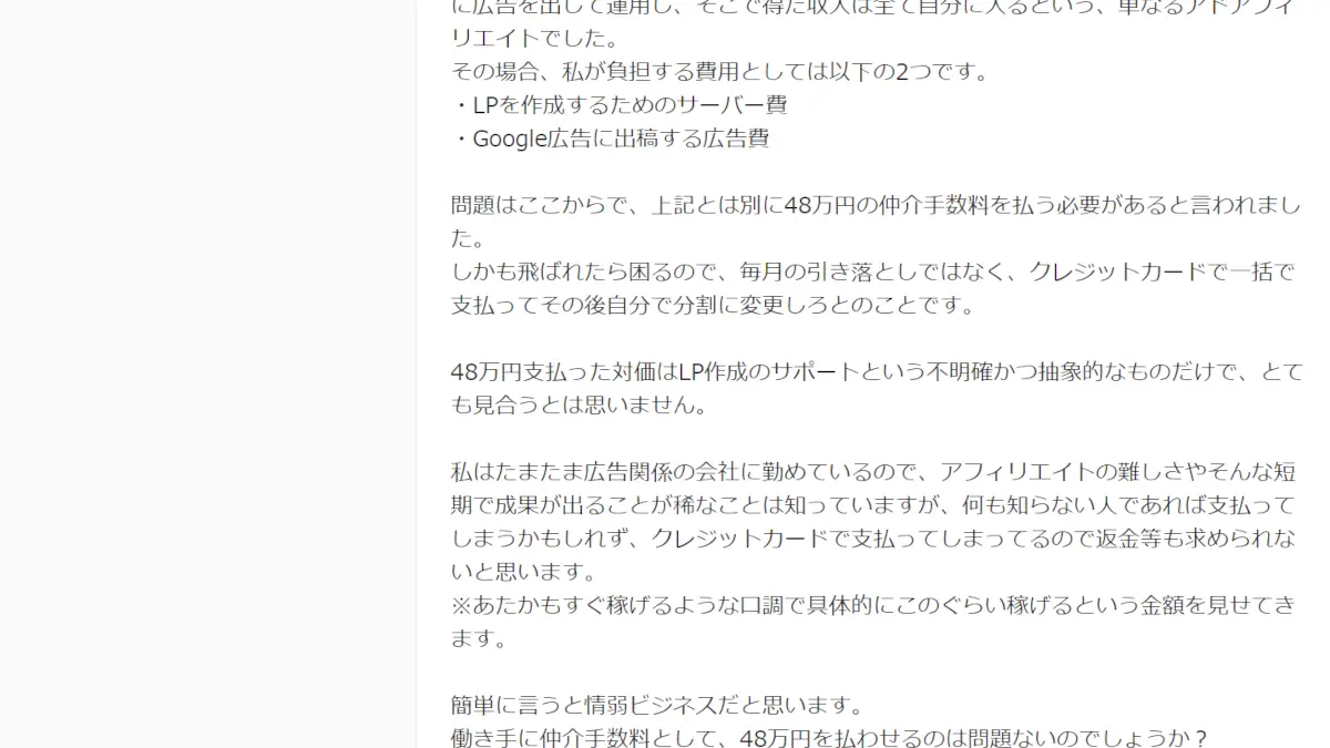 面接もほぼ9割がアフィリエイトの話で、興味が向くように誘導されました。マジで恐ろしい。