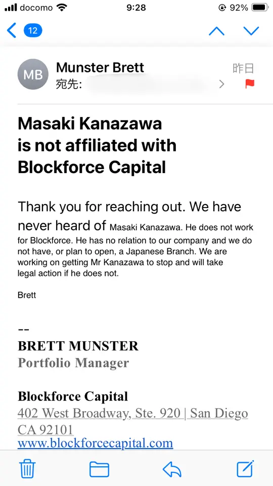 Google検索ではアメリカのBlockforce Capitalは休業中と表示されています。返信はありましたか?