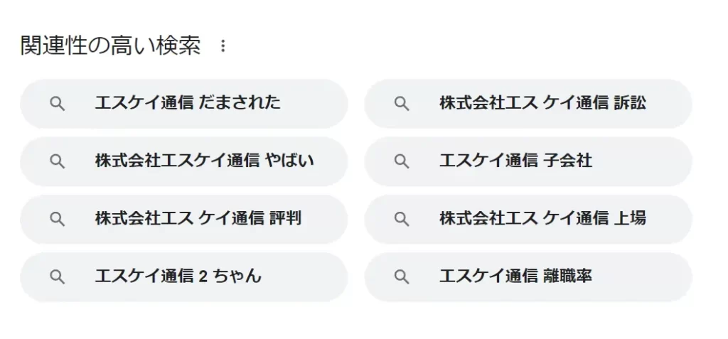 また、この株式会社エス・ケイ通信のグーグルにおける検索サジェスト結果を見ると、「だまされた」「」やばい「訴訟」などの、ちょっと関わりたくない単語、警戒すべき単語が出てきます。サジェストに出るということは、その単語が株式会社エス・ケイ通信と共に検索されている、ということにほかなりません。