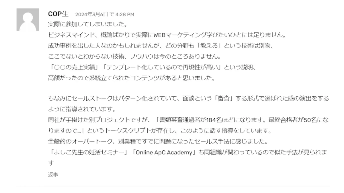 表記画像にあるように、よしこ先生の妊活セミナーには怪しい組織が関わっているという口コミが投稿されていました。