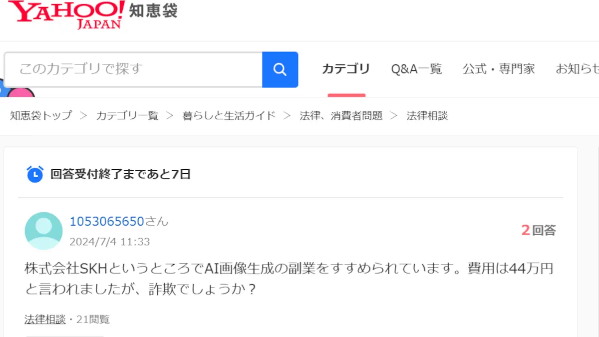 株式会社SKHという会社が募集をしている「AI画像生成の副業講座」は怪しいので受講しないようくれぐれもご注意ください。株式会社SKHについては、