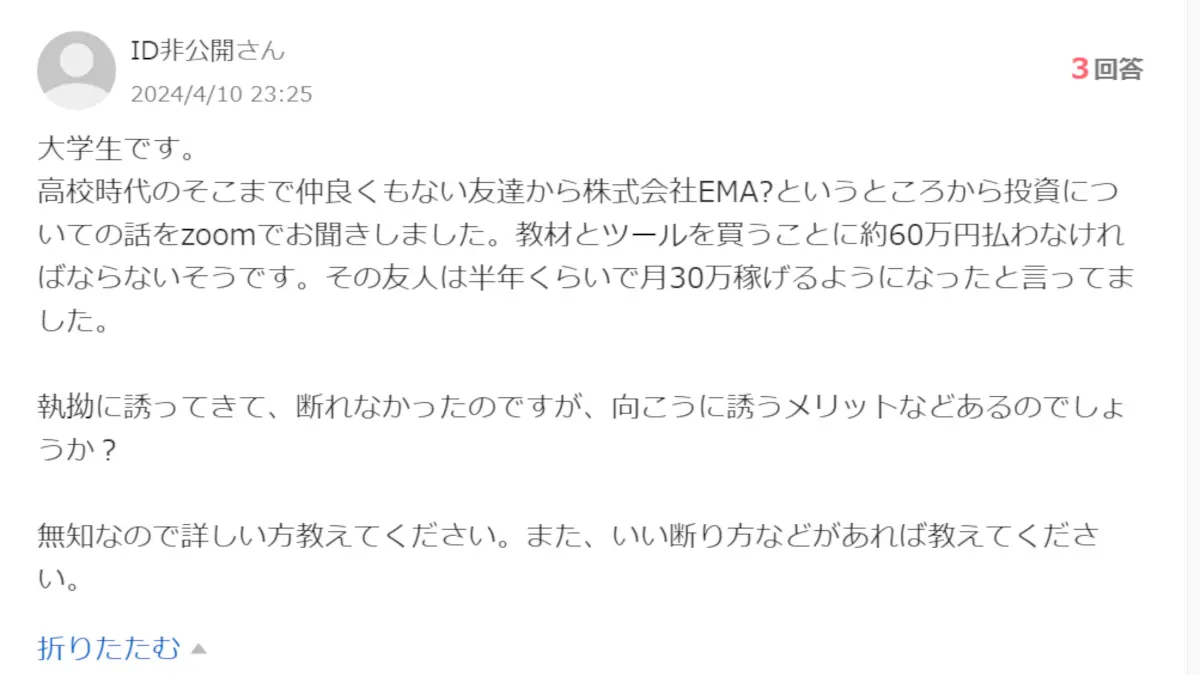 「そんなに仲良くなかった知り合いから急に電話が来て株式会社EMAの投資に勧誘された」
