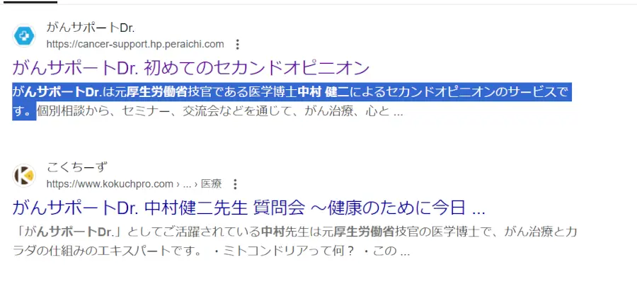 さて、それでも中村健二などという名前、特に珍しくもない。それだけで疑うのはさすがにやり過ぎと思われるかも知れませんが、このガンサポートDr.の中村医師、なんとその経歴に厚生労働省の技官だった時代があるのです。そして、それはがんサポートDr,のページにも堂々と記載があります。(以下、Googleの検索結果からの引用です。)