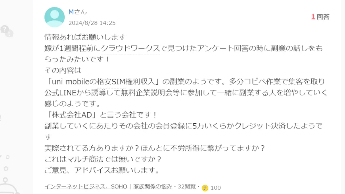 ユニモバイルの運営会社は株式会社ADSというところなのですが、この副業は信用できるのでしょうか?