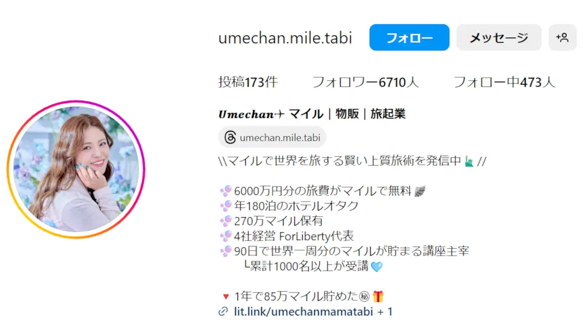 そのヒントになりそうなのが彼女のブログ『旅資産づくりナビゲーター✈︎Umechanオフィシャルブログ』(https://ameblo.jp/umemamatabi)にありました。