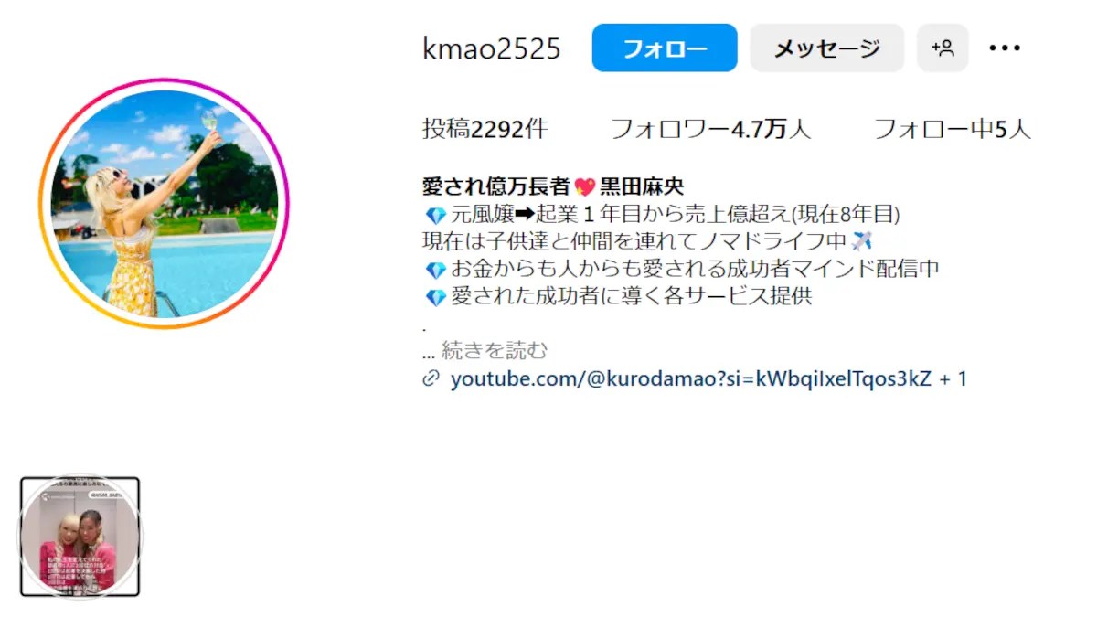 黒田麻央は「愛され億万長者」というキャッチフレーズでInstagramやYouTubeの情報発信をしています。https://www.instagram.com/kmao2525