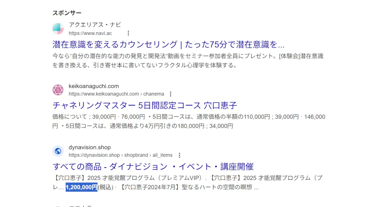 ただ、一方でダイナビジョンや穴口恵子で検索してみると「怪しい」とか「詐欺」といった検索候補も出てきます。