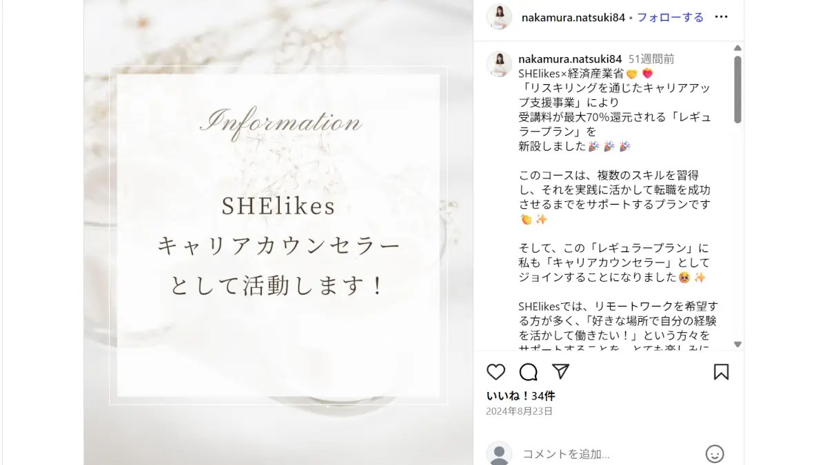 また、中村菜月は、怪しいという評判が多い「SHElikes」という団体でキャリアカウンセラーとして活動しています。