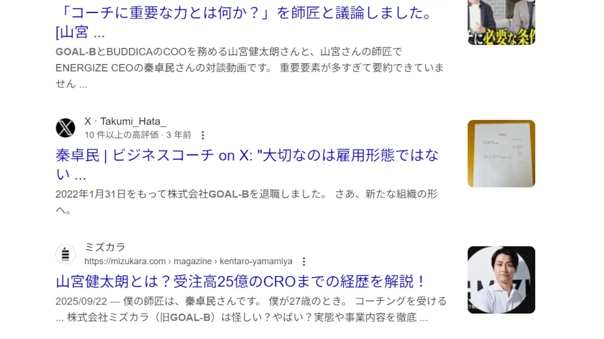 経営コンサルタントは、日本では中小企業診断士という資格が存在し、個人事業主として開業している方もあれば、大手企業として運営されているところもあります。さて、すべての経営コンサルタントが、という主語を大きくするつもりはありません。ただ、警鐘を鳴らしたいとあるコンサルについて、今回は語らせて頂きたいと思います。株式会社ENERGIZE、代表は秦卓民。こちらの会社は一見普通の経営コンサルタントに見えますし、もちろんそこはそうなのでしょう。では何が?と思われるかもしれませんが、それが、この秦卓民はGOAL-Bという企業の関係者として、なぜかその経歴や実績をあまり表に出そうとしていません。そして、そのGOAL-Bは現在ミズカラという名前に変わっています。この両者がどんな会社なのかというと、それはコーチングです。
