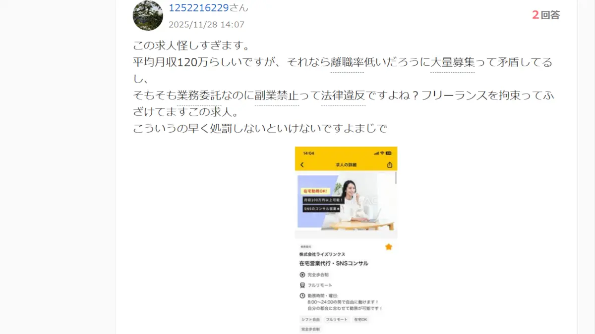 中島雅斗が代表を務める株式会社ライズリンクス(電話番号:052-228-1927,0522281927)の求人が怪しいということで話題になっています。株式会社ライズリンクスは、SNSコンサルの業務委託として募集していますが、「完全在宅で年収3000万円が稼げる・月収120万円を稼げる」という求人広告は、一般的な感覚からすると通常の求人とは考えにくい内容です。どんな怪しい仕事をさせられるかわからないので、株式会社ライズリンクスが募集をする業務委託の求人には応募しないほうが良いのではないでしょうか。