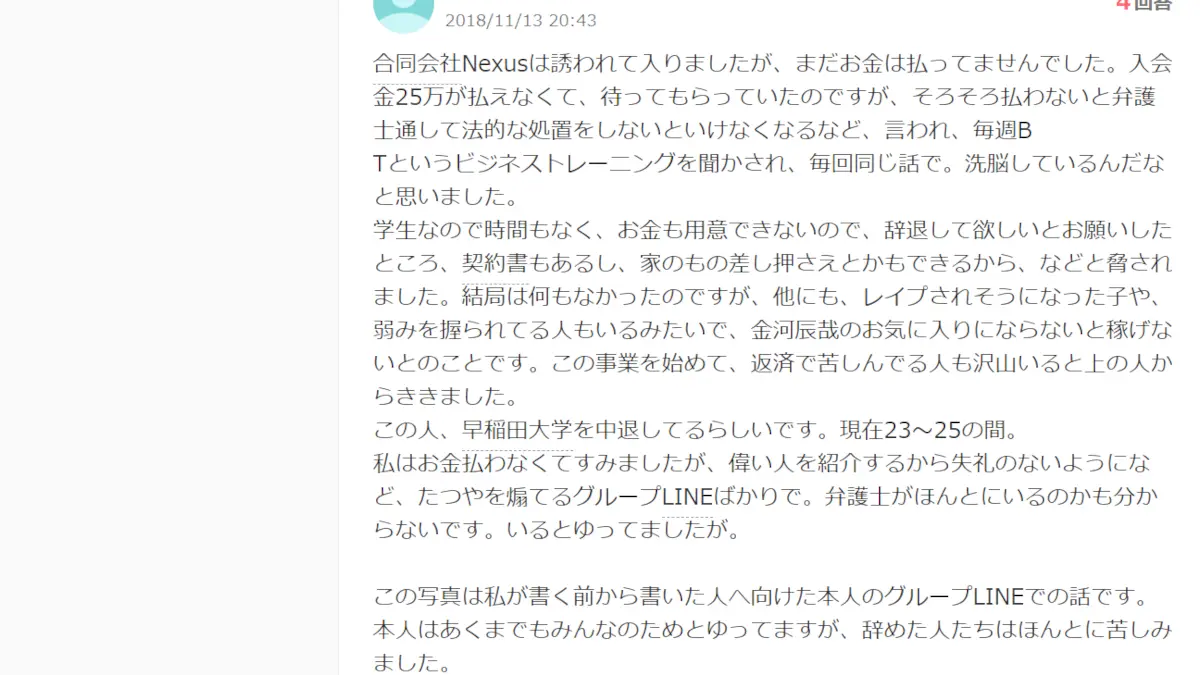 もちろん本サイトは、これらの口コミを真実だと主張していません。金河辰哉やAI Lab株式会社が人を脅したりレイプしたとは断言していません。この口コミを信じるかどうかは読者様個々人の判断にお任せします。本サイトの目的は、マルチのグループに参加をしてしまうとトラブルに巻き込まれやすくなるという一般論を述べ、注意喚起をすることです。