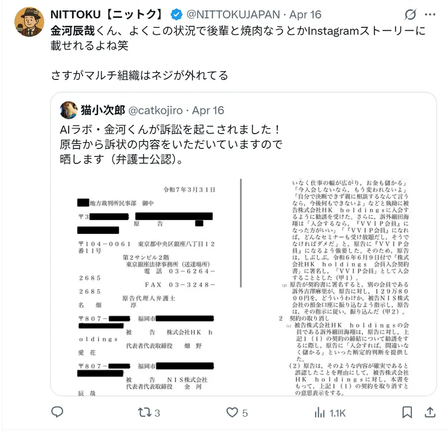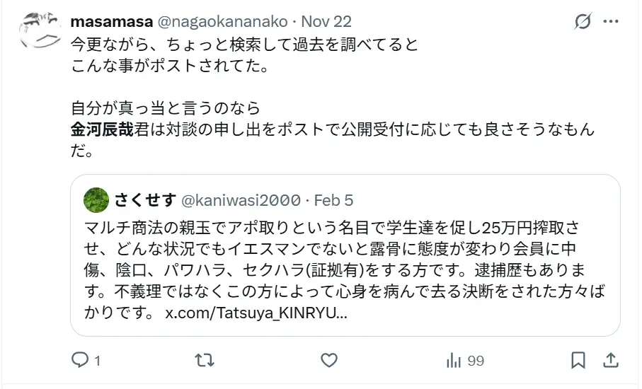 以下、AI Lab株式会社の金河辰哉に関する評判の一部です。ぜひ参考にしてください。