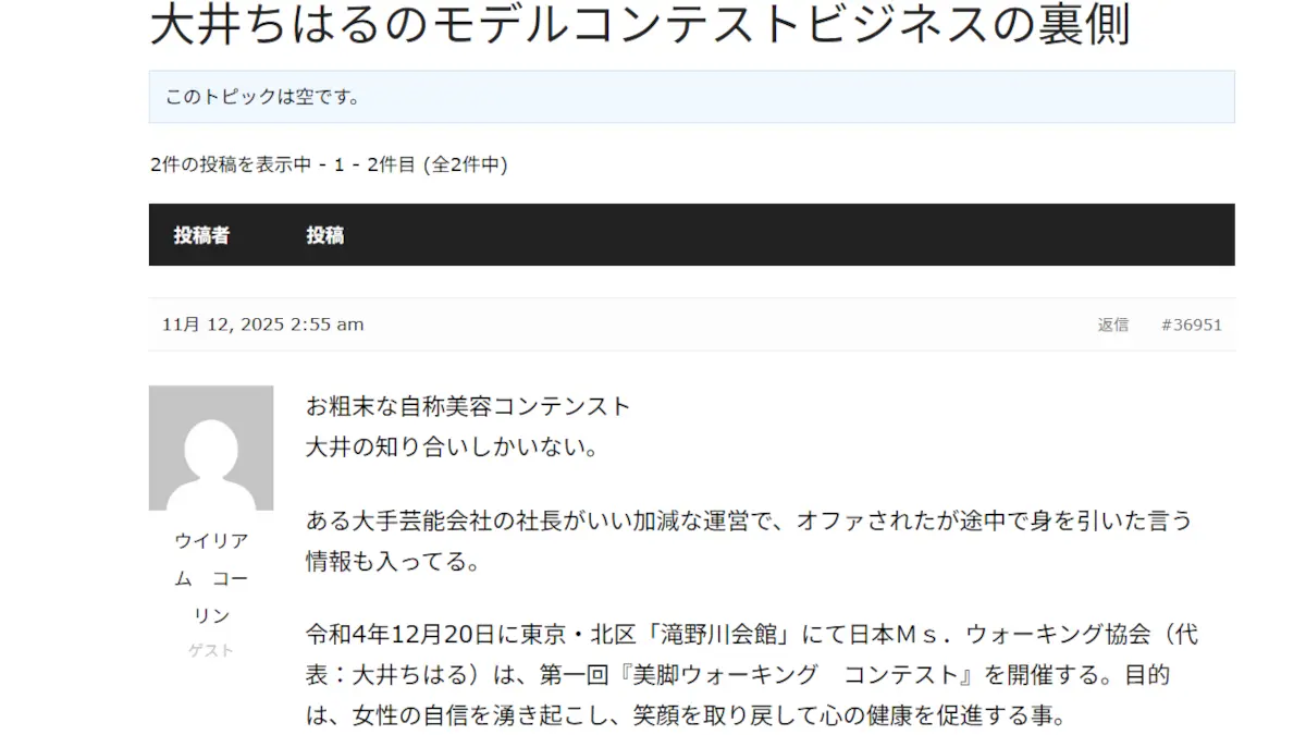 ネットの口コミでは、大井千春(大井ちはる)の知り合いしかいない美容コンテストが開催されていた、協会に会員が存在しない、どこからも承認されていないなどの指摘があります。(https://riskhedge.observer/forums/topic/%e5%a4%a7%e4%ba%95%e3%81%a1%e3%81%af%e3%82%8b%e3%81%ae%e3%83%a2%e3%83%87%e3%83%ab%e3%82%b3%e3%83%b3%e3%83%86%e3%82%b9%e3%83%88%e3%83%93%e3%82%b8%e3%83%8d%e3%82%b9%e3%81%ae%e8%a3%8f%e5%81%b4/)