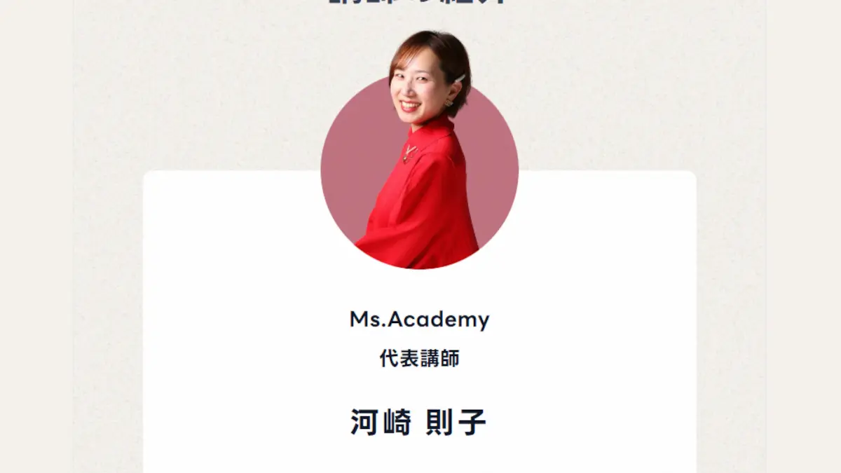 河崎則子が代表講師を務める「Ms.Academy(ミスアカデミー)」は、女性向けキャリアスクールをうたったサービスで、WebデザイナーやSNSマーケターといった副業をサポートするサイトです。