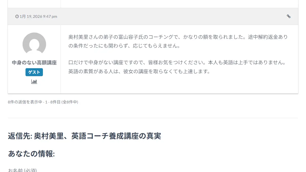 「奥村美里さんの弟子の富山容子氏のコーチングで、かなりの額を取られました。途中解約返金ありの条件だったにも関わらず、応じてもらえません。口だけで中身がない講座ですので、皆様お気をつけください。本人も英語は上手ではありません。英語の素質がある人は、彼女の講座を取らなくても上達します。」