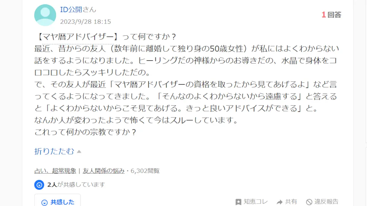 さて、そんな人達に一定の支持を集めるものがスピリチュアル系と言われる、宗教とは違う何らかの精神世界や神仏などに関わるジャンルです。いっときのオカルトブーム、或いは占いなどの類も大まかにはここに含まれます。そして今回私が警鐘を鳴らさせていただくのは、このスピリチュアル系のこと、一般社団法人が運営しているマヤ歴アドバイザーというものです。