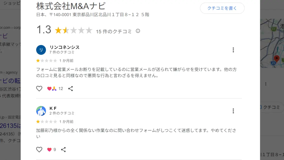 口コミでは「営業メールを大量に送ってくる」「営業メールお断りと書いてある問い合わせフォームを利用して営業をかけてくる」といったものばかりです。